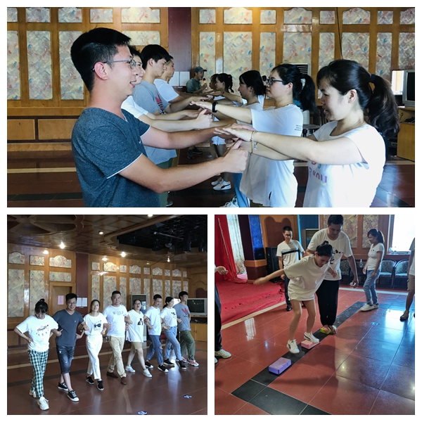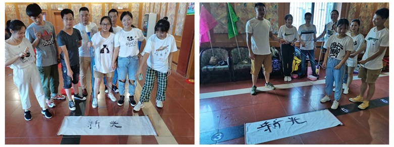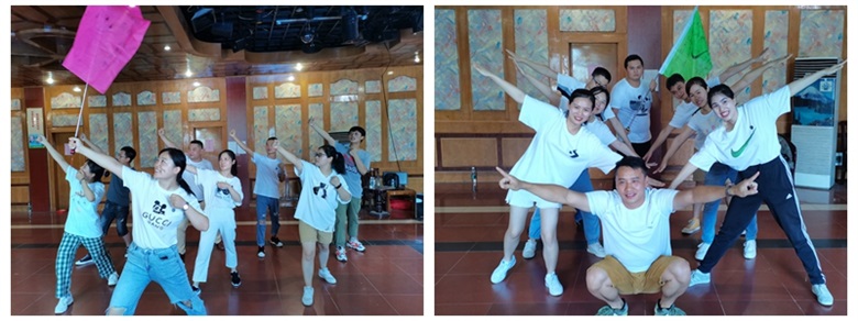烈日当空,团建拓展正式开始。教练通过简单的两个破冰小游戏,让活动室里瞬间被欢笑声席卷,趁热打铁,教练即刻通过报数分组分出2个小队。各小队在活动室进行小队的队名、口号、队徽、队形的集体创新探讨与设计展示。
