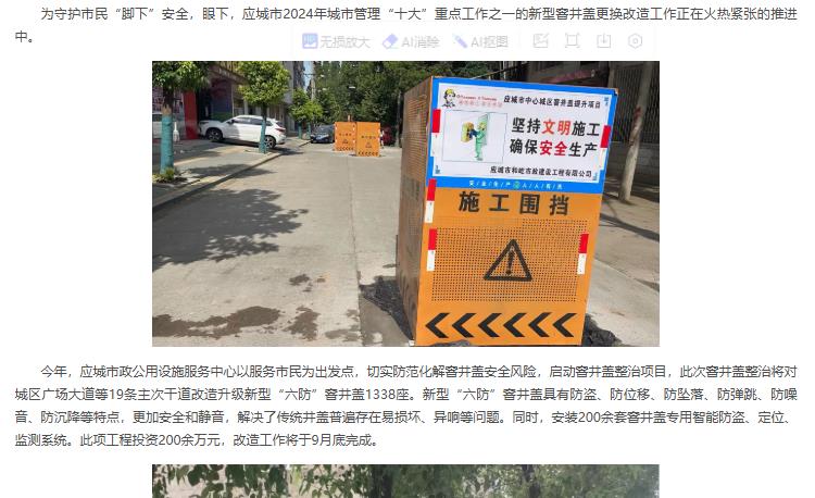 为守护市民“脚下”安全,眼下,多地开展城市新型窨井盖更换改造。如应城市2024年已开展切实防范化解窨井盖安全风险,启动窨井盖整治项目,此次窨井盖整治将对城区广场大道等19条主次干道改造升级新型“六防”窨井盖1338座。新型“六防”窨井盖具有防盗、防位移、防坠落、防弹跳、防噪音、防沉降等特点,更加安全和静音,解决了传统井盖普遍存在易损坏、异响等问题。同时,安装200余套窨井盖专用智能防盗、定位、监测系统。