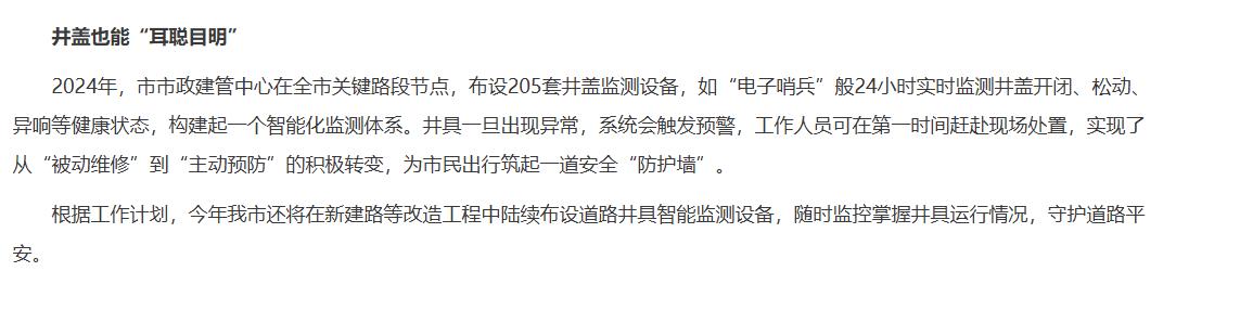 为解决这些问题,多地已经试点安装智能井盖,比如2024年,太原市市政建管中心在全市关键路段节点,布设205套井盖监测设备,如“电子哨兵”般24小时实时监测井盖开闭、松动、异响等健康状态,构建起一个智能化监测体系。