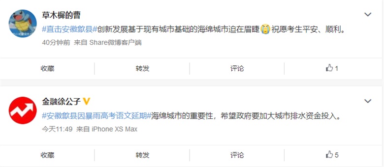 高考第一天,安徽歙县遭遇50年一遇的洪涝灾害,歙县考区原定7月7日语文、数学科目考试延期举行。微博上,网友们在为高考考生和歙县人民生命财产忧心的同时,也对歙县的排水系统、城市建设与精细化管理等问题进行了关注。